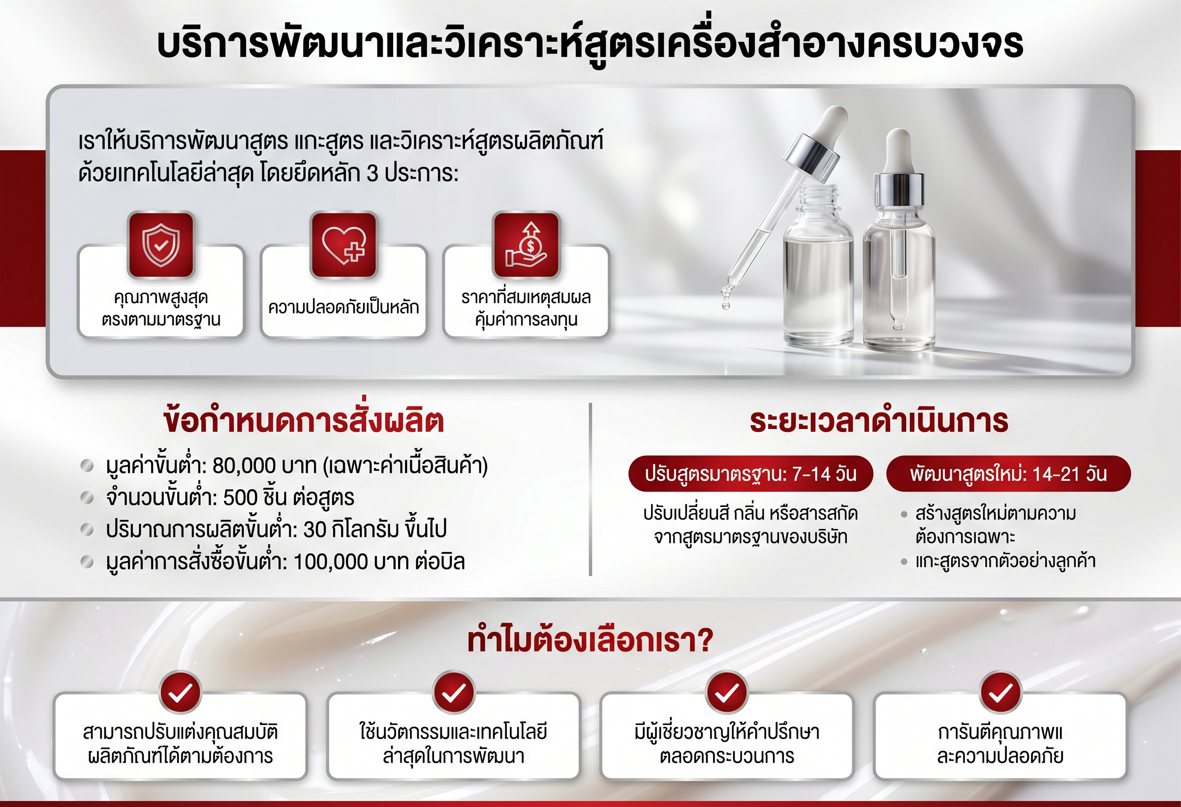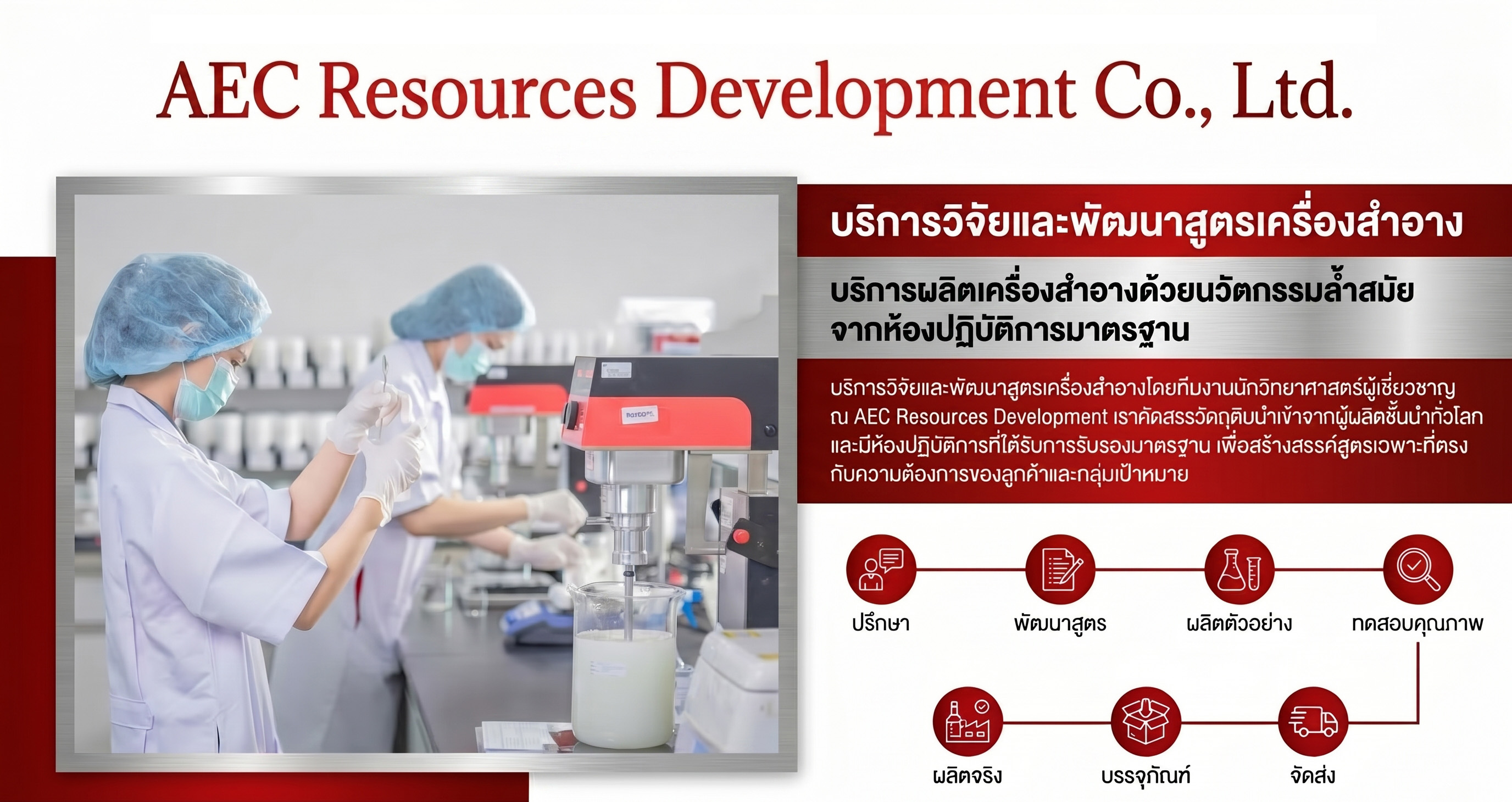 หากคุณกำลังมองหาพาร์ทเนอร์ที่เข้าใจและสามารถสร้างสรรค์สูตรเครื่องสำอางที่ตรงใจ AEC Resources Development รับผลิตเครื่องสำอาง พร้อมเป็นส่วนหนึ่งในความสำเร็จของคุณ ติดต่อเราวันนี้เพื่อปรึกษาเกี่ยวกับแนวคิดผลิตภัณฑ์ และให้ทีมนักวิทยาศาสตร์ของเราช่วยพัฒนาสูตรที่โดดเด่นสำหรับแบรนด์ของคุณ