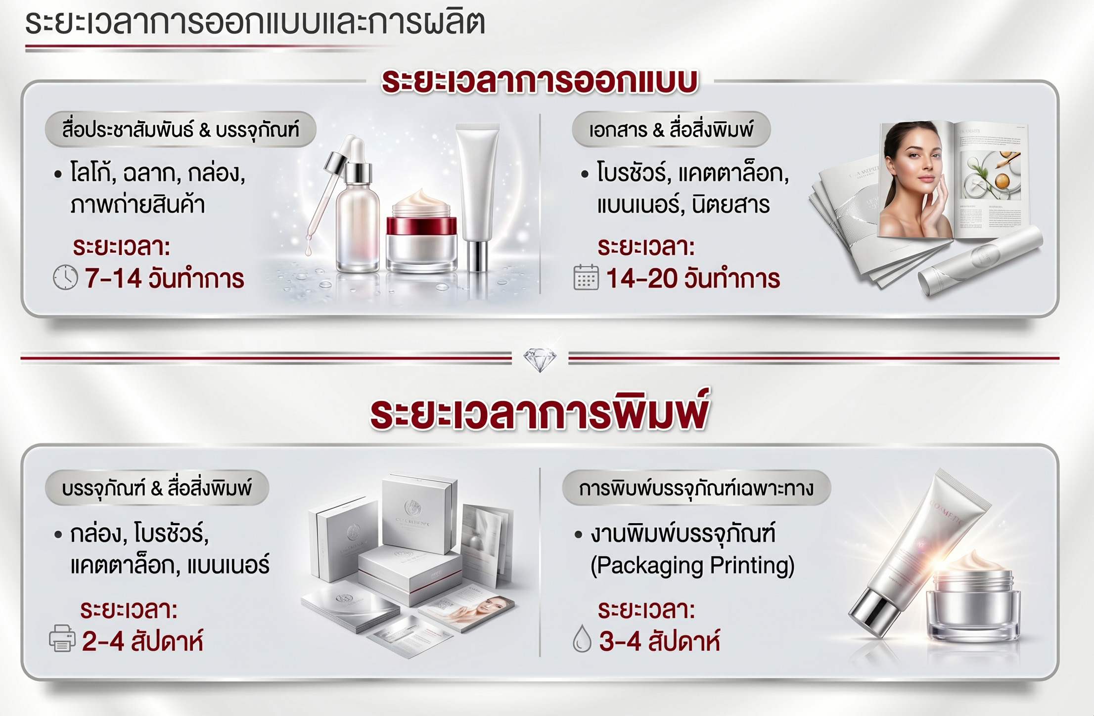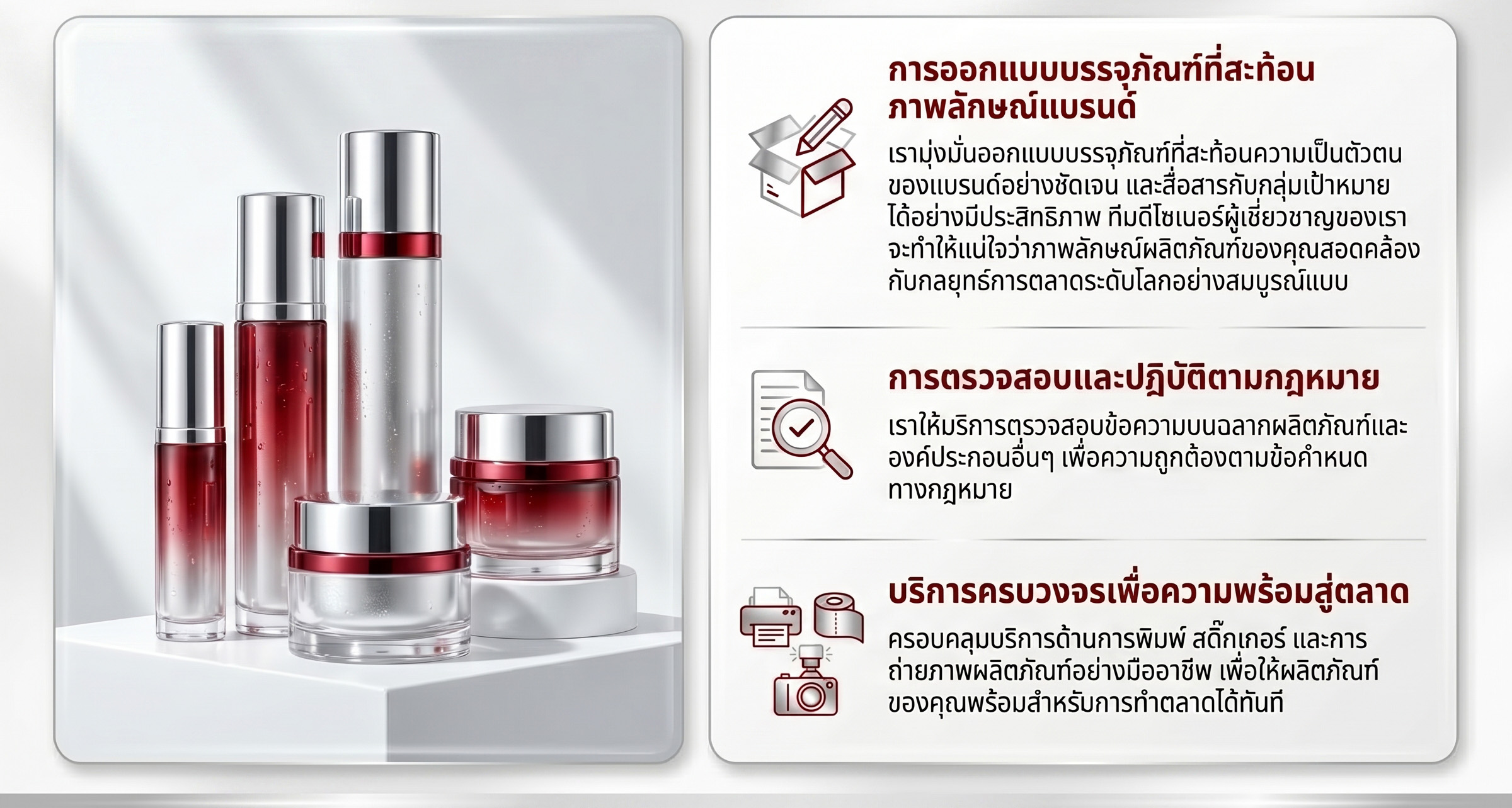 สร้างความประทับใจแรกพบกับลูกค้าของคุณผ่านบรรจุภัณฑ์ที่โดดเด่น ไม่ซ้ำใคร ให้ AEC Resources Development รับผลิตเครื่องสำอาง ช่วยออกแบบอัตลักษณ์แบรนด์ที่จะช่วยให้สินค้าของคุณโดดเด่นบนชั้นวางสินค้า ติดต่อเราวันนี้เพื่อเริ่มต้นการออกแบบที่จะทำให้แบรนด์ของคุณเป็นที่จดจำ