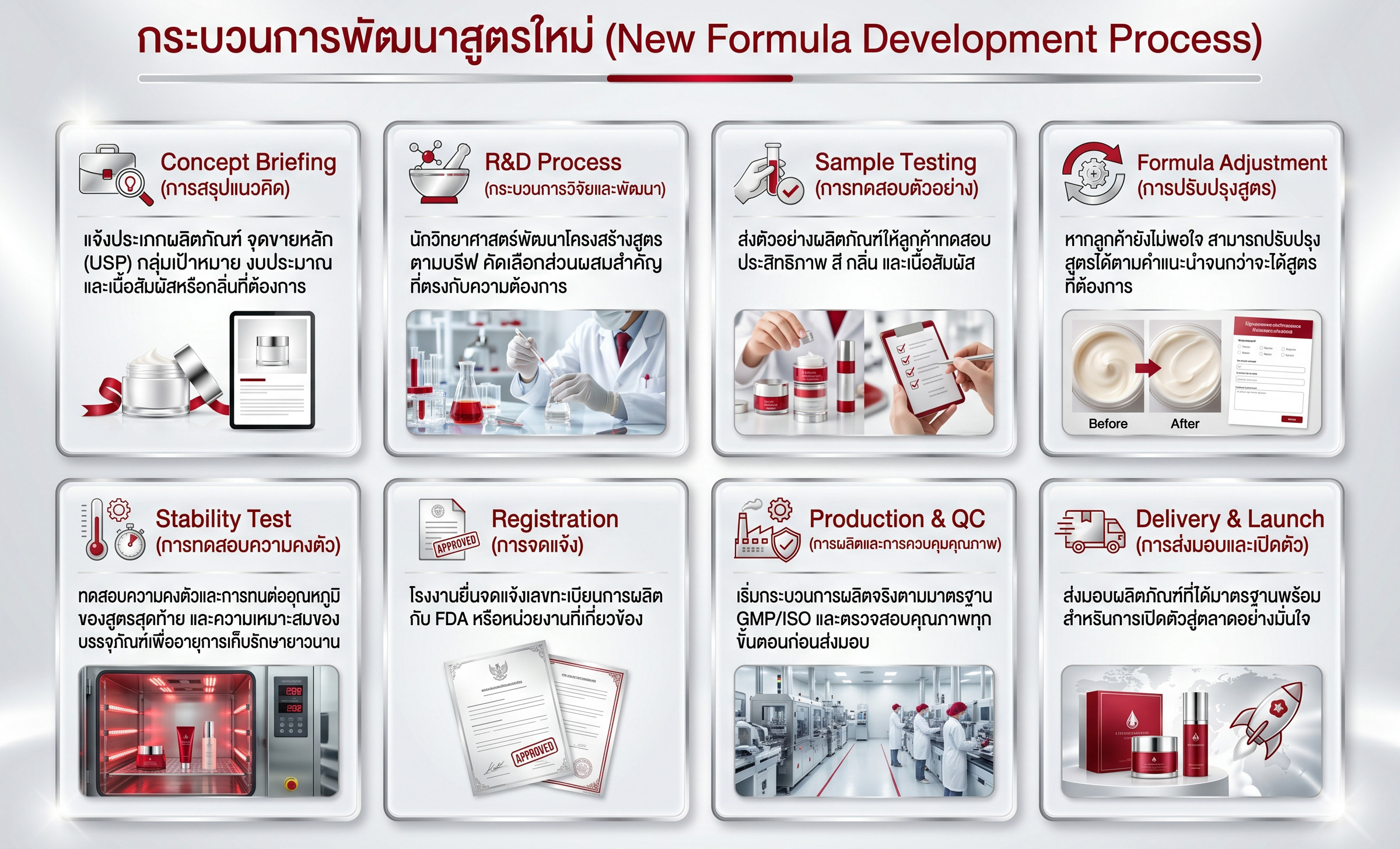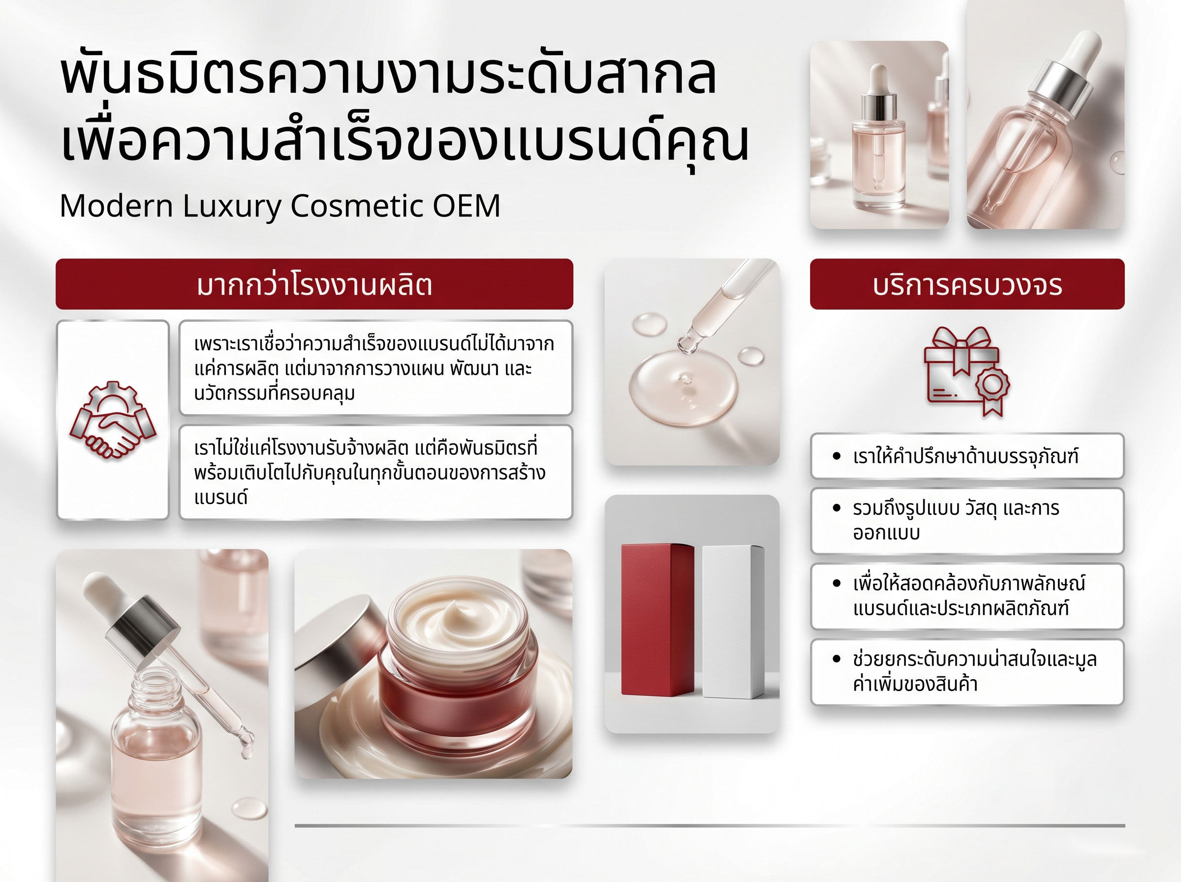 ไม่ว่าคุณต้องการพัฒนาสูตรเครื่องสำอางใหม่ที่แตกต่างหรือปรับปรุงสูตรเดิมให้ดียิ่งขึ้น AEC BKK โรงงาน OEM ของเราพร้อมให้บริการด้วยมาตรฐาน GMP เครื่องสำอาง ที่เชื่อถือได้ ติดต่อเราวันนี้เพื่อปรึกษาและรับข้อเสนอพิเศษสำหรับการพัฒนาสูตรใหม่ที่จะทำให้แบรนด์ของคุณโดดเด่นในตลาด